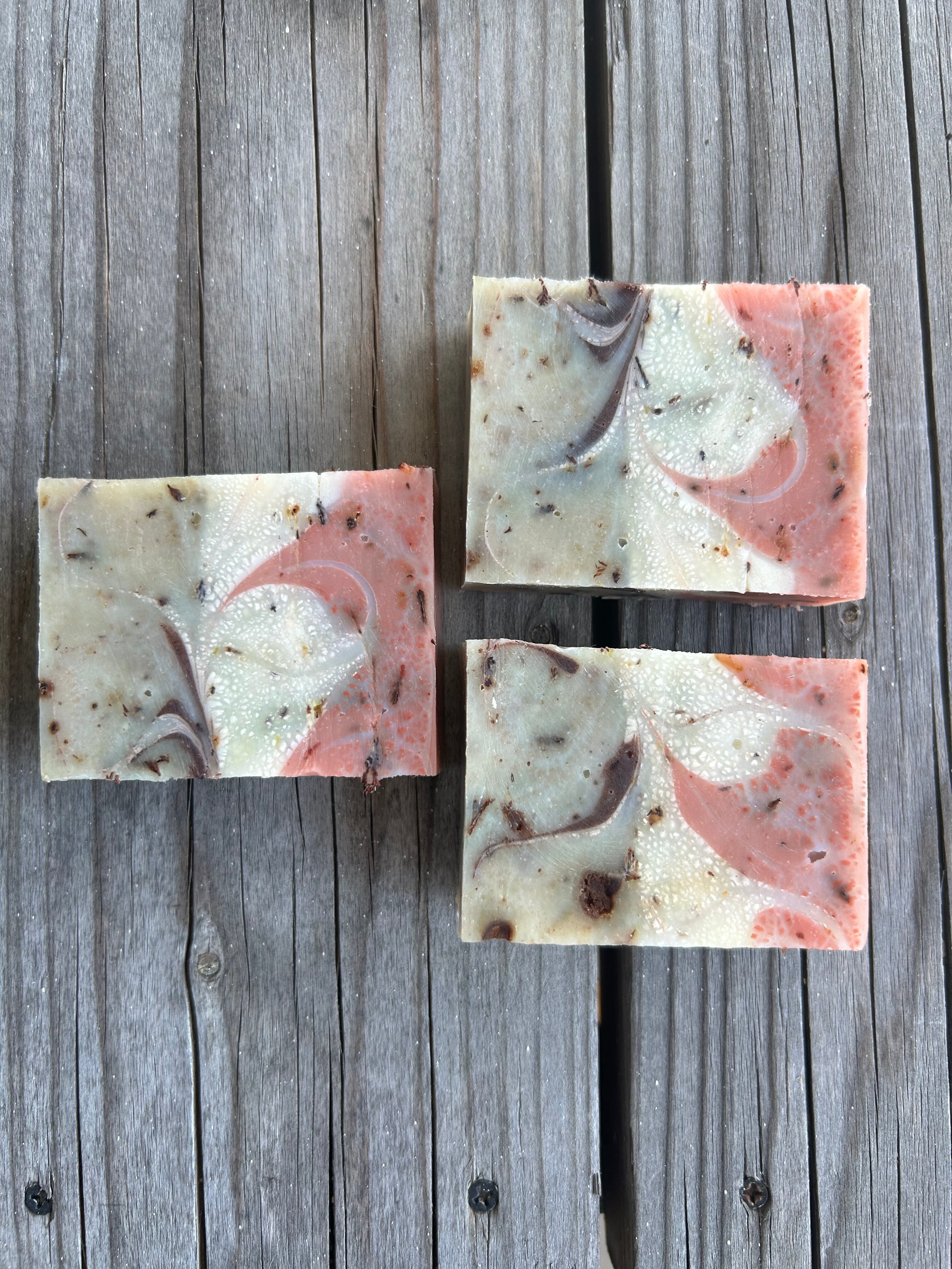 オリーブ油、パーム油、ココナッツ油、水、水酸化Na、ヒース、ローズヒップ、ローズクレイ、ココアパウダー、水酸化クロム、ゼラニウム油